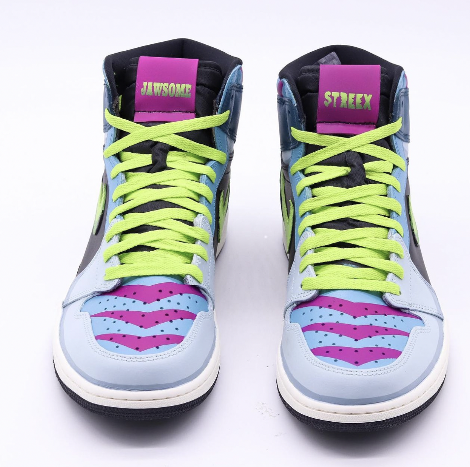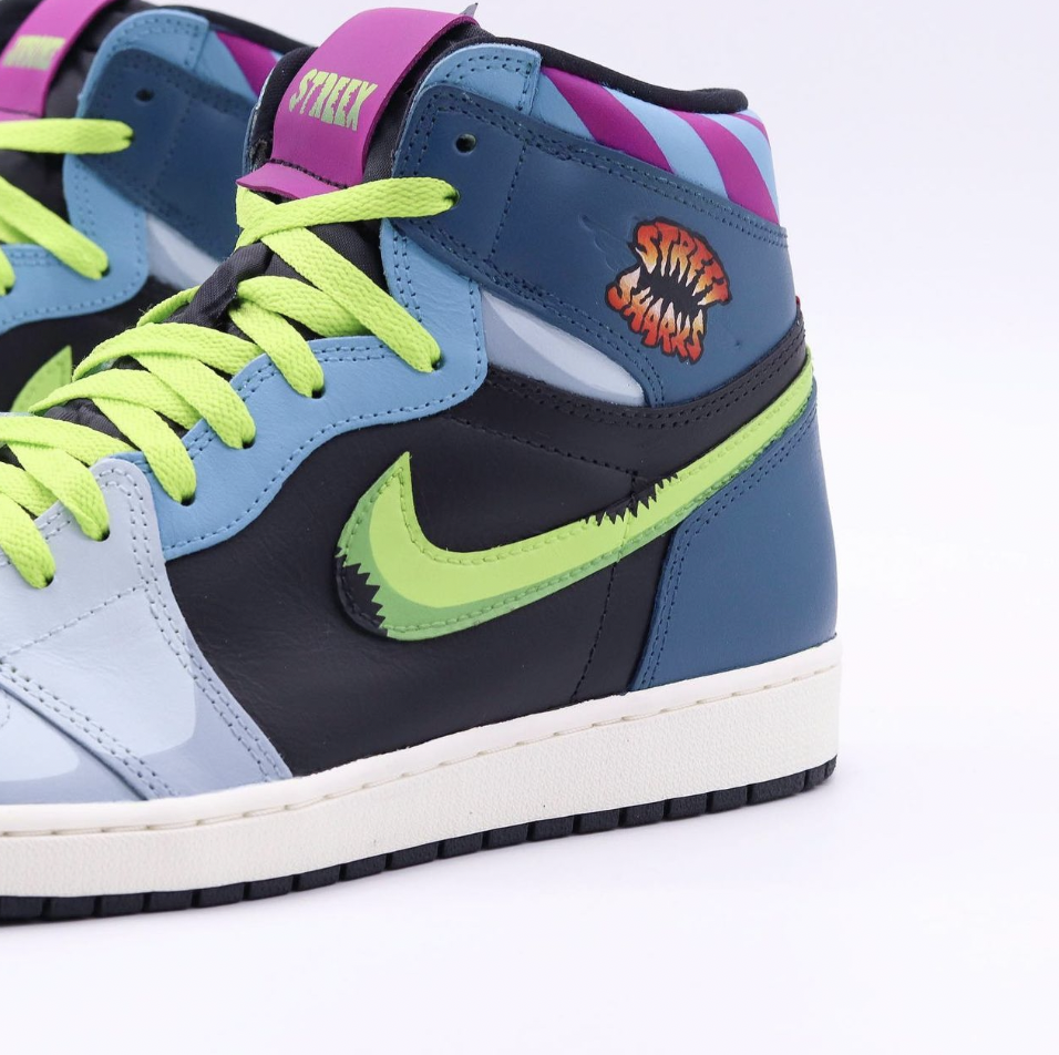Unleash your inner Jawesome with our custom Air Jordan 1, designed with a Street Sharks theme! These sneakers take you back to the 90s, featuring a bold aquatic color palette of deep blues, grays, and splashes of red that capture the essence of the ocean’s fiercest predators. Shark-skin textured overlays, fin-like details, and toothy graphics pay homage to the animated shark heroes that ruled the streets. Perfect for fans of the cult-classic cartoon and sneakerheads who love a unique twist, these custom AJ1s blend retro nostalgia with modern streetwear flair. Whether you’re stomping through the city or catching waves of compliments, these Street Sharks-themed Jordans will have you making a splash wherever you go!